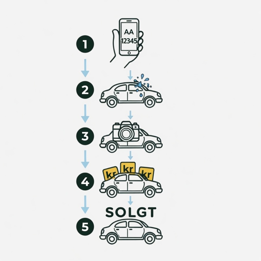 Send inn info om bilen din så får du et prisestimat innen 4 timer (man-fre kl. 08:00–16:00). Er du fornøyd med estimatet? Velg tid for gratis henting i Oslo-området (inkl. Fredrikstad, Moss, Asker, Drammen), Trondheim, Bergen og Stavanger-området – eller lever selv. Vi vasker bilen innvendig og utvendig, fotograferer, og NAF eller Viking takserer den. Deretter konkurrerer 1500 forhandlere om bilen, og du får tilsendt høyeste bud. Godtar du budet, signerer du digitalt – og pengene er på kontoen din innen 2–3 virkedager.